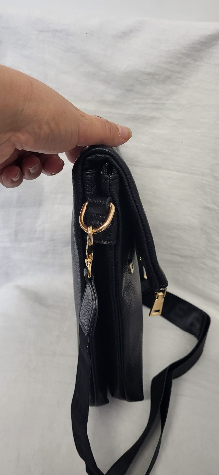 - Gold tone metal hardware