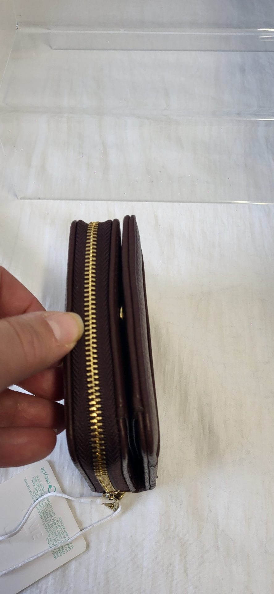 - Gold tone metal hardware