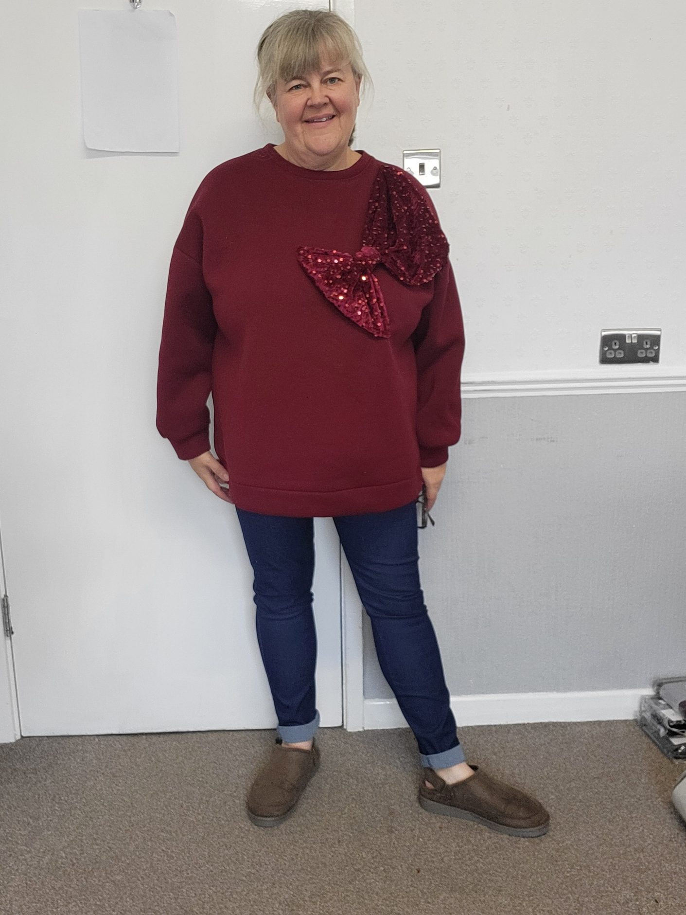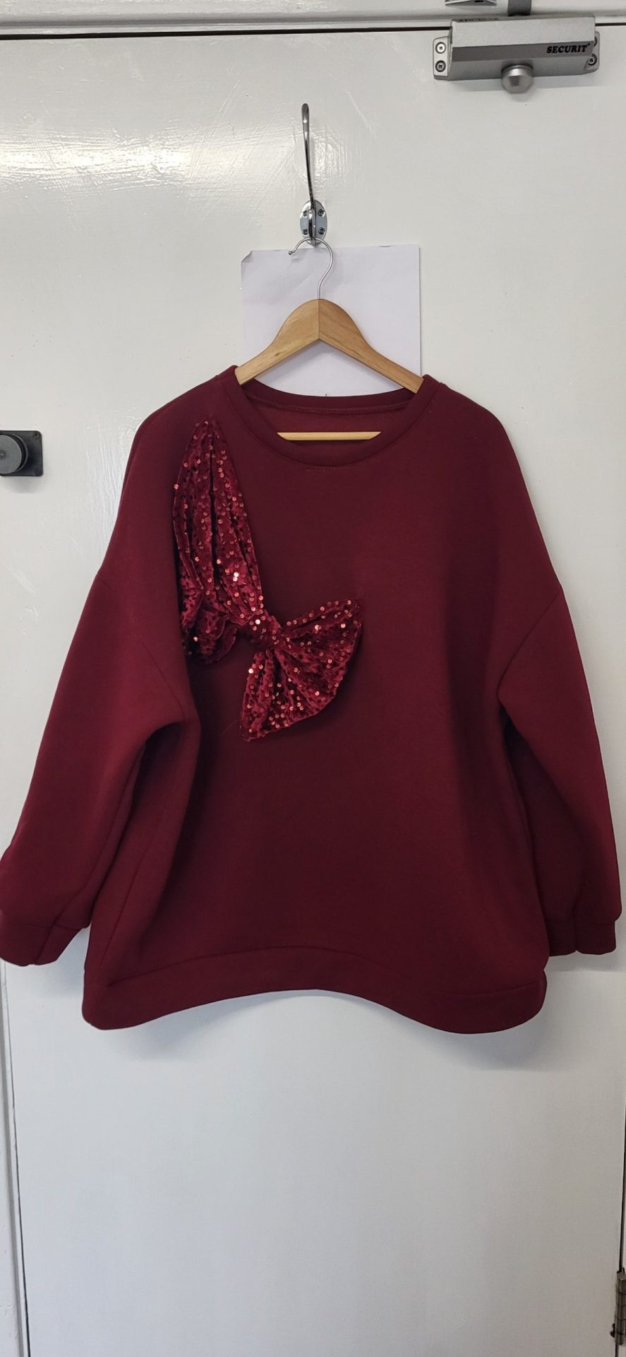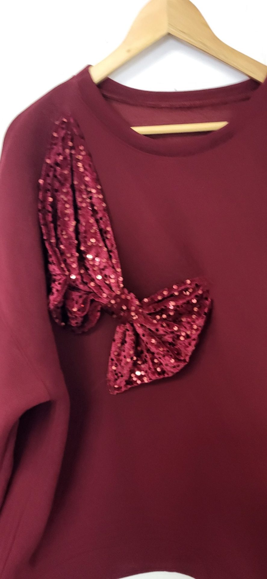 New Ladies Burgundy Sequin Bow Sweatshirt One Size fits sizes 18 20 22 24