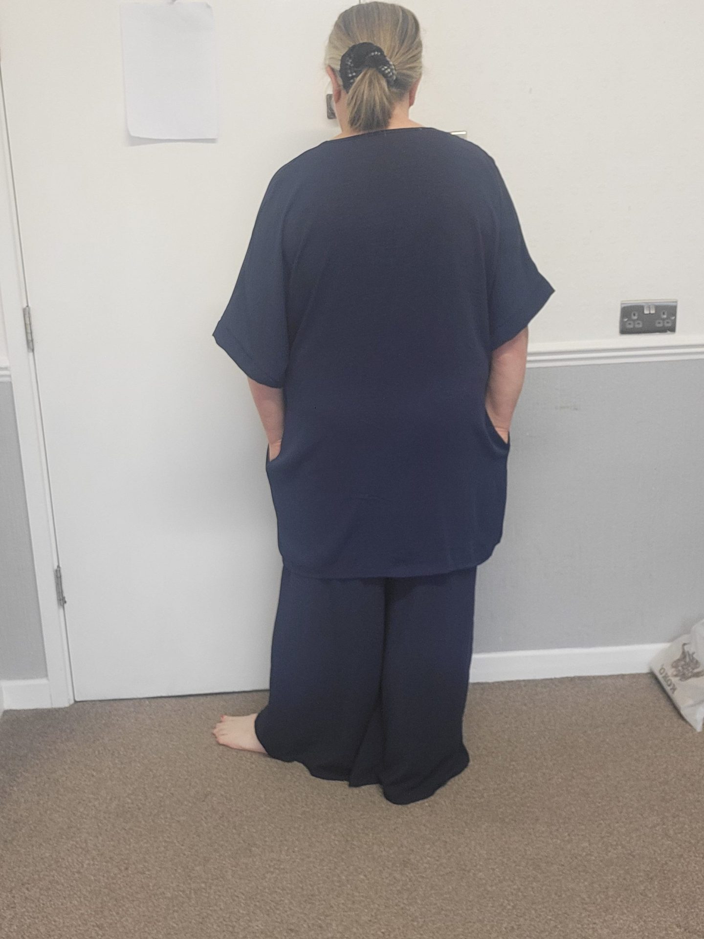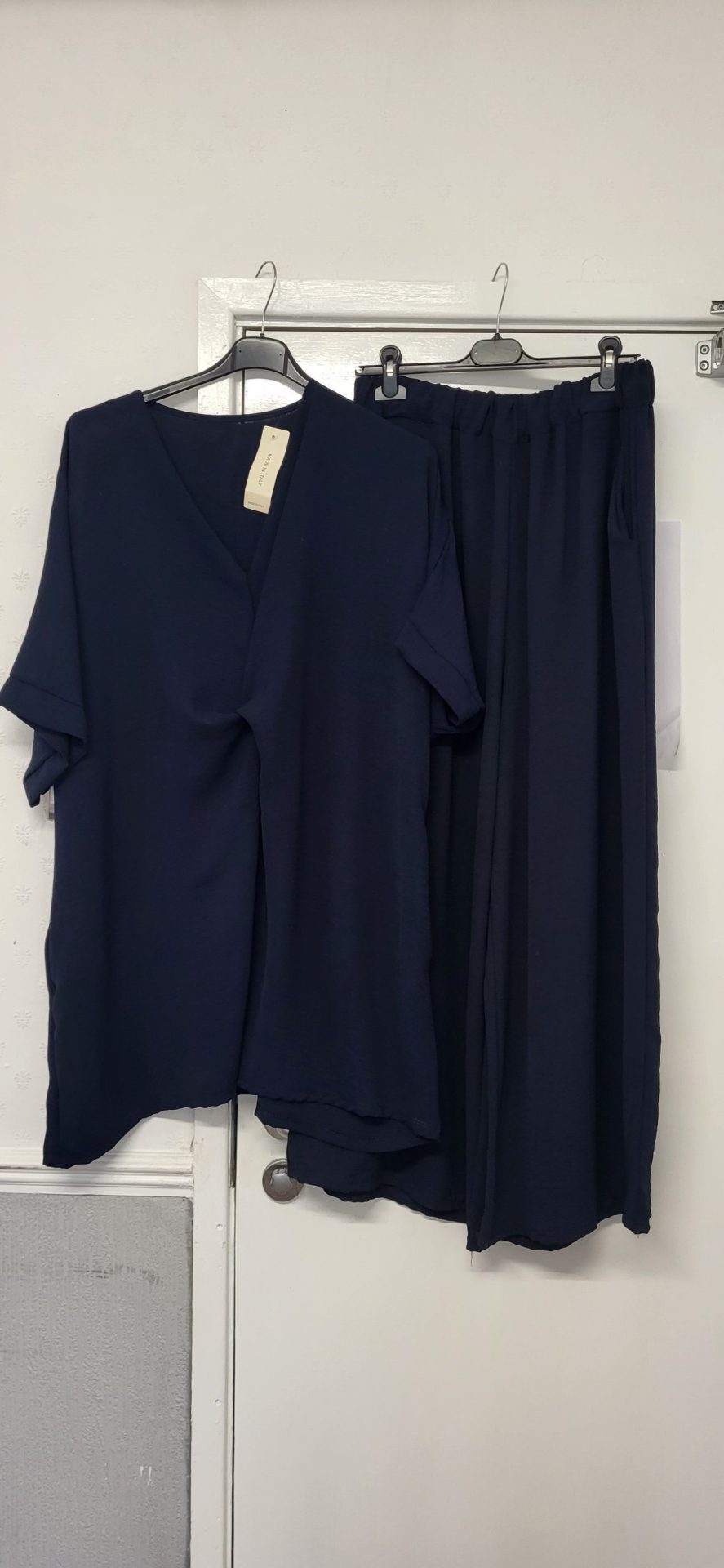 Lovely trousers and v neck top set. The top has pockets in. One of the pockets has got a small hole in it. But can easily be stitched up.